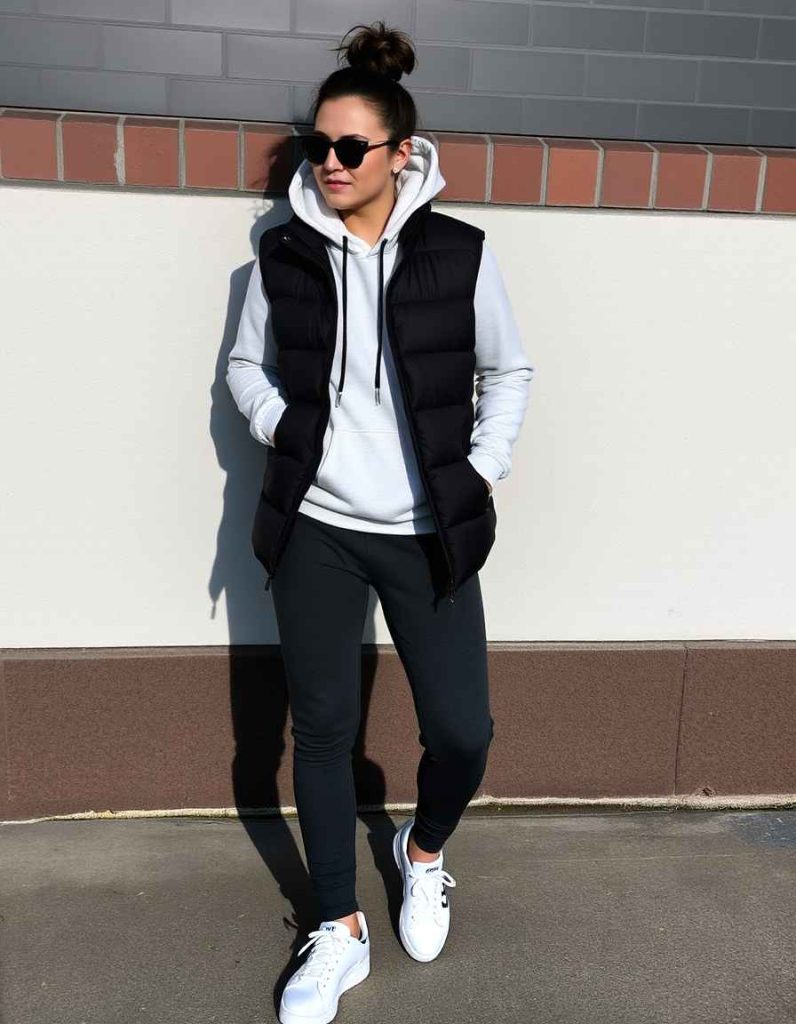 Stay cozy and fashionable with a snug vest outfit for women showcasing a black puffer vest layered over a hoodie, paired with joggers. This sporty look is perfect for outdoor adventures or weekend activities. Complete the ensemble with sneakers for comfort without sacrificing style.