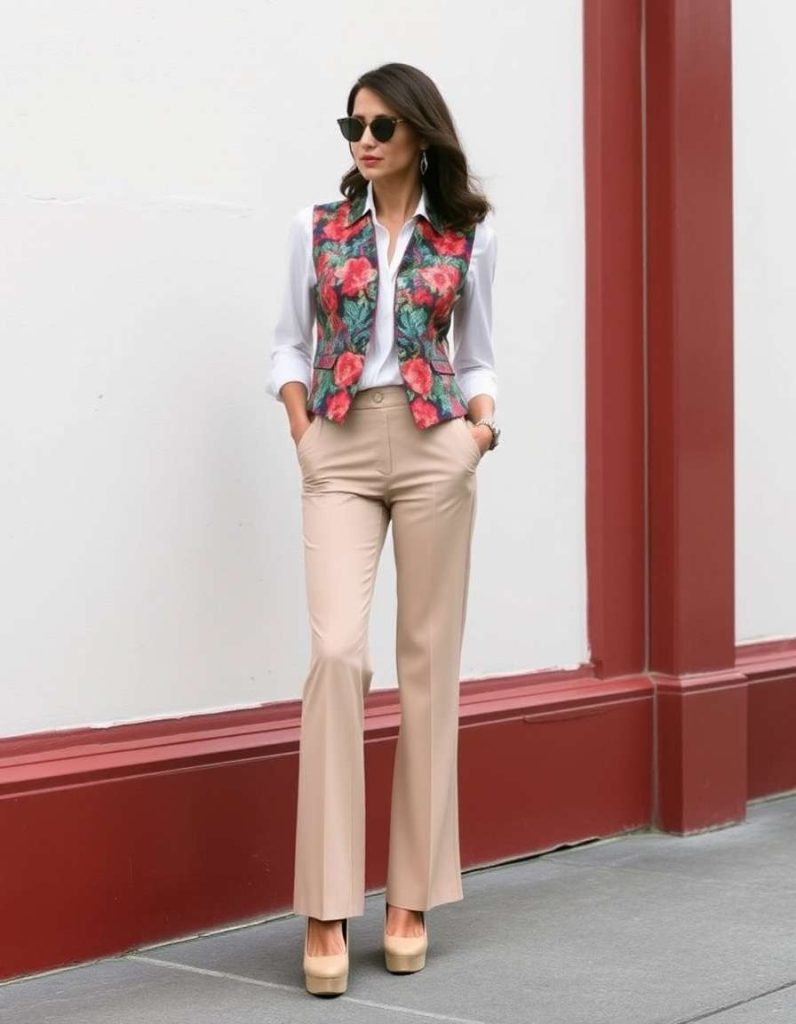 Make a statement with a colorful printed vest layered over a neutral blouse, matched with flared trousers in this vibrant vest outfit for women. The retro appeal of flared pants adds an element of drama and style, while the print injects personality into the overall appearance. Finish with platform heels for a bold and fashionable ensemble.