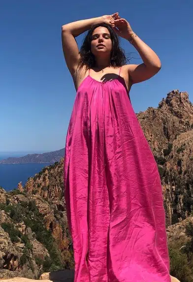 A flowing hot pink maxi dress with strappy sandals and layered accessories creates a quintessential bohemian atmosphere. Ideal for outdoor gatherings or casual summer days, this Hot Pink Dress Outfit Inspiration embodies effortless beauty. Match it with a wide-brim hat for that carefree, whimsical appearance.