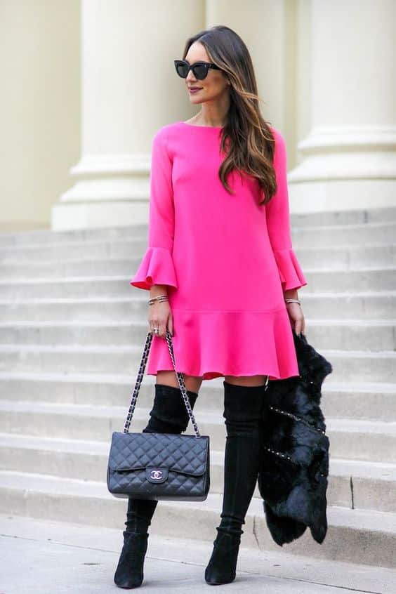 Stay warm and fashionable in a hot pink sweater dress combined with knee-high boots and a wool coat. This Hot Pink Dress Outfit Inspiration injects warmth and vibrance into chilly days while keeping you effortlessly chic. Add a knit scarf and gloves for an added touch of winter refinement.