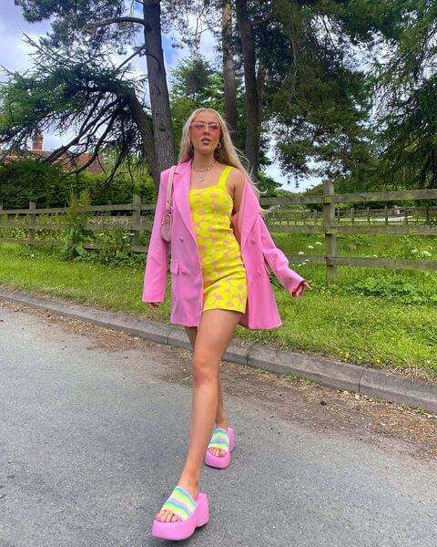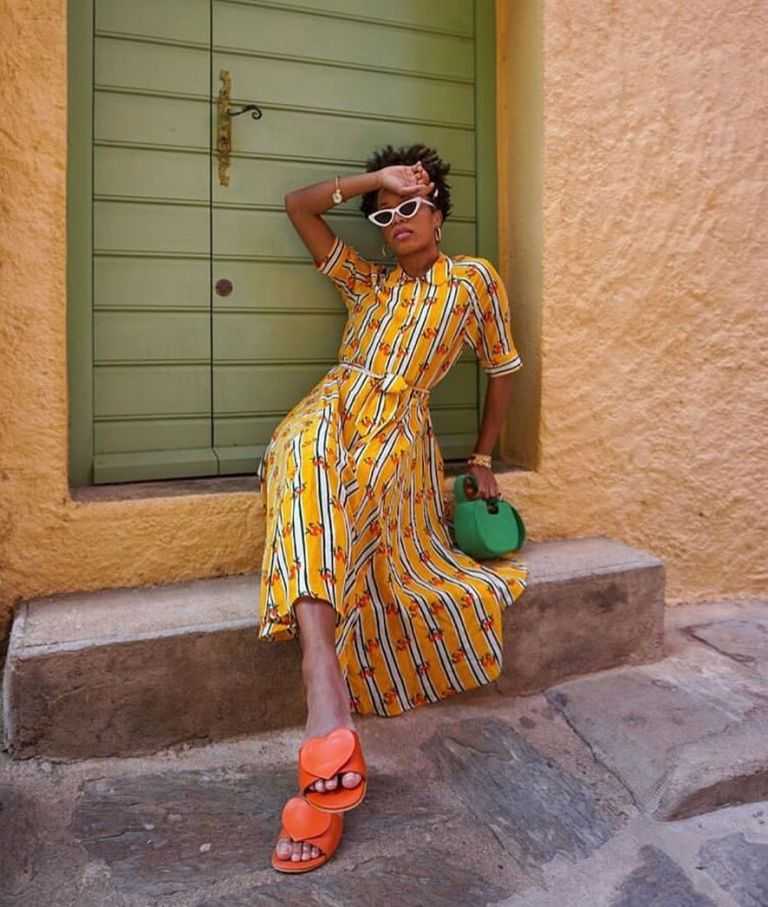 For a relaxed atmosphere, choose a bright yellow summer dress accompanied by simple accessories. A yellow maxi dress teamed with strappy sandals and a woven tote creates an effortlessly chic appearance, ideal for a beach trip or a picnic in the park. Adding minimal jewelry keeps the ensemble casual yet fashionable. You can also experiment with yellow mini dress combinations paired with white sneakers for a youthful and lively look that’s perfect for errands or socializing with friends.
