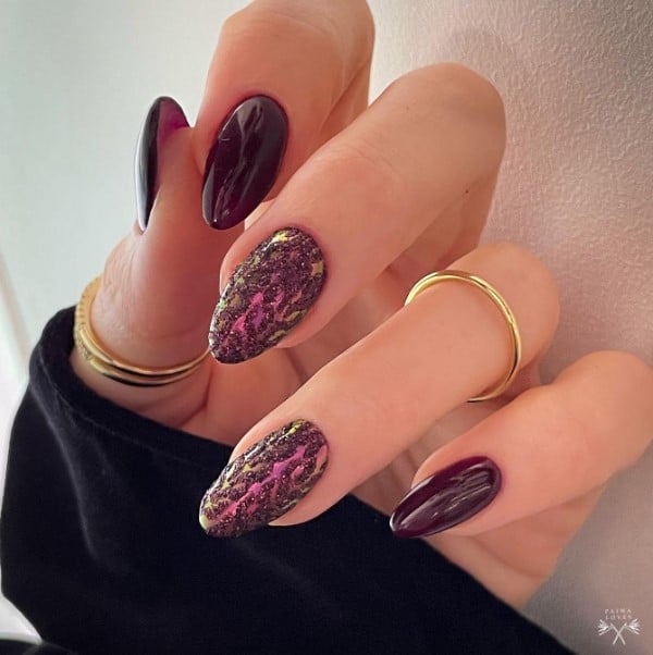 Sparkling knit design December nails meld comfy winter aesthetics with festive twinkle. The knit motif…evokes coziness, while the shimmer contributes a hint of festive enchantment. Ideal for individuals wanting to maintain their nails both fashionable and suitable for winter this December.