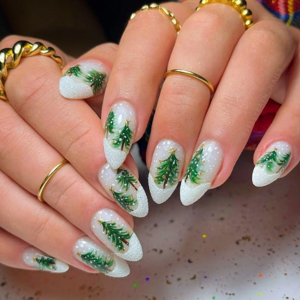 Pine trees in snow themed December nails showcase the splendor of a winter woodland. Detailed green trees contrasted with a snowy backdrop embody the spirit of the season. Embrace nature and festive allure with these cheerful December nails displaying tranquil winter imagery.