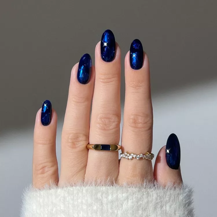 Icy sapphire nails deliver a rich, deep blue hue to your December manicure, resulting in a chic and wintery aesthetic. The sapphire shade radiates an air of sophistication, while the icy texture imparts a frosty, festive essence. This design suits those who favor a bold yet elegant appearance.
