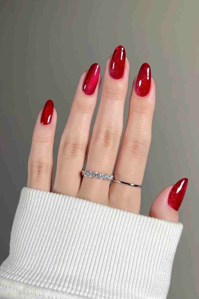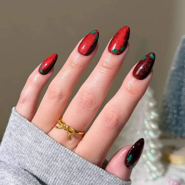Red velvet holly nails merge rich crimson hues with festive greenery, crafting a warm and joyful manicure. The velvety texture enriches the design, making it ideal for December nails. These nails wonderfully embody the warmth and merriment of the holiday period.