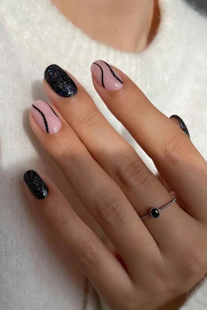 Black glitter December nails merge the intensity of black with the twinkle of glitter for a captivating display. This design is perfect for those who appreciate bold yet festive styles for the holiday season. Black glitter nails serve as a standout option for your December manicure.