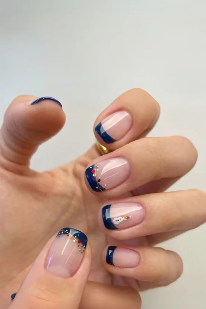 Navy tips on December nails are a stylish reinterpretation of the classic French manicure, featuring a deep, cool hue well-suited for winter. This design introduces a modern flair to the traditional style, presenting a refreshing and festive feel for your December nails. Navy tips are perfect for those pursuing elegance alongside a splash of color.