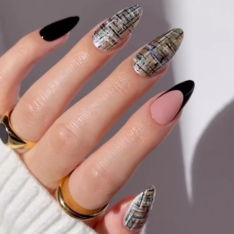 Black, gold, and silver tweed nails introduce a refined yet festive element to your December nail designs. This intricate style