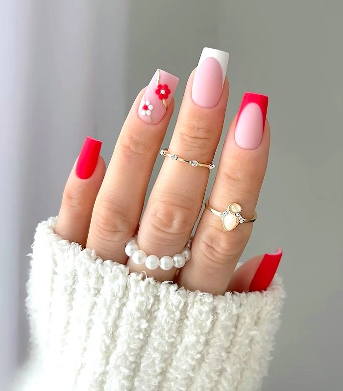 Make an impression with May Nail Ideas showcasing bold floral patterns in bright spring tones. Oversized petals in vivid pink, red, and coral deliver a captivating, artistic effect. This design is perfect for individuals who adore eye-catching floral-inspired manicures that radiate confidence and allure.