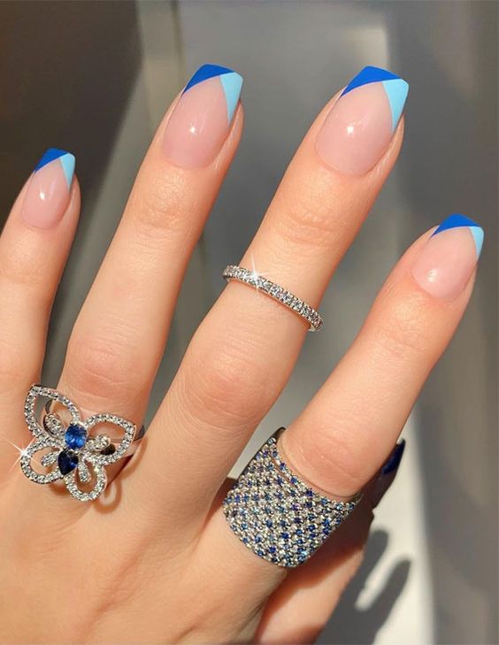 For a contemporary and edgy style, May Nail Ideas featuring a center divider in blue offer a minimalist yet stylish charm. A bold stripe splitting two contrasting hues creates a striking layout. Whether complemented with pastels or deep blues, this appearance exudes effortless sophistication.