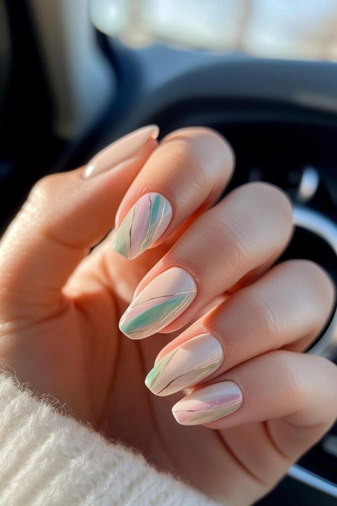 Embrace imagination with May Nail Inspirations featuring abstract pastel stripes in soft, ethereal tones. This artistic style intertwines swirling shades of lavender, peach, and light blue, resulting in a fashionable yet gentle manicure. Ideal for spring, these nails contribute a refined yet playful essence to your seasonal appearance.