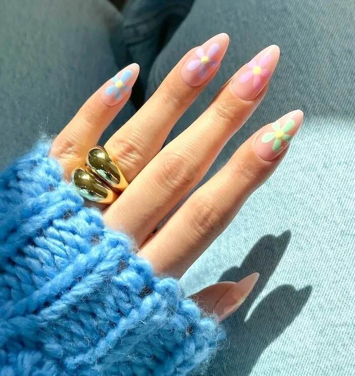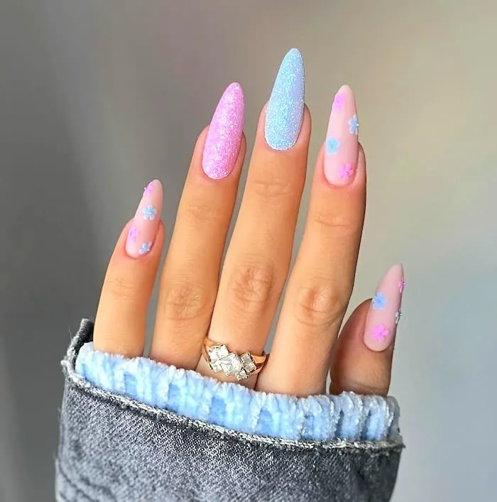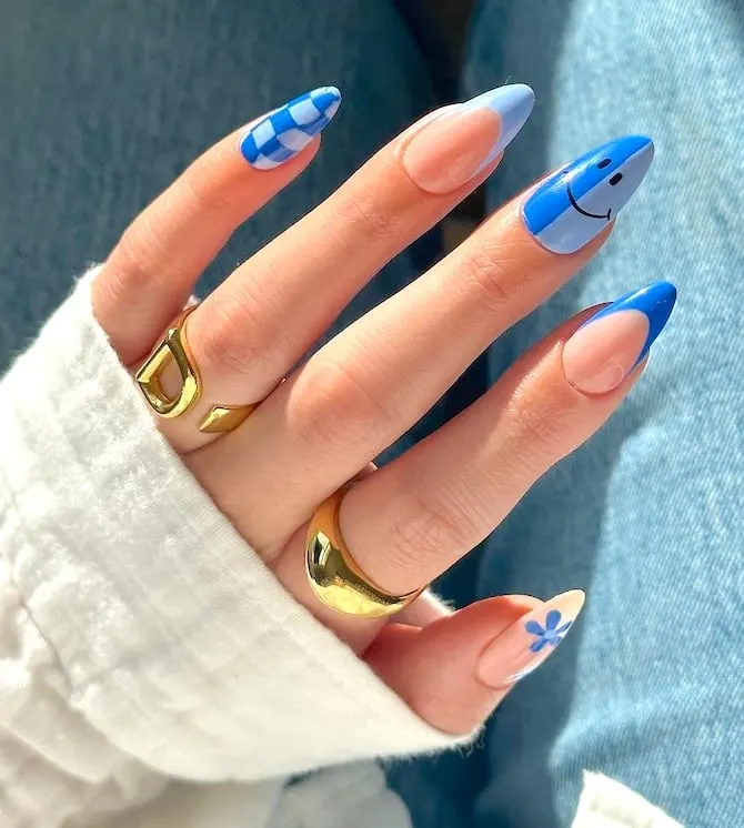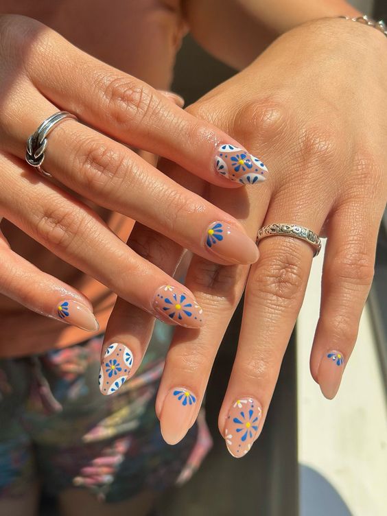 Infuse cheerful vibes into your manicure with May Nail Ideas that involve blue and yellow floral patterns. These vibrant floral accents introduce a fun yet stylish aspect to your nails. The contrasting tints offer a bold and refreshing look, perfect for spring.