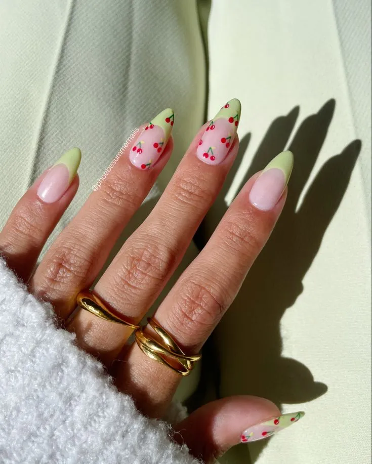 Add a whimsical and fruity element to your manicure with May Nail Ideas showcasing cherry nail patterns. Small red cherry designs on a nude or pastel pink backdrop evoke a fresh and youthful atmosphere. This charming yet fashionable appearance is ideal for embracing the playful and vibrant spirit of spring.