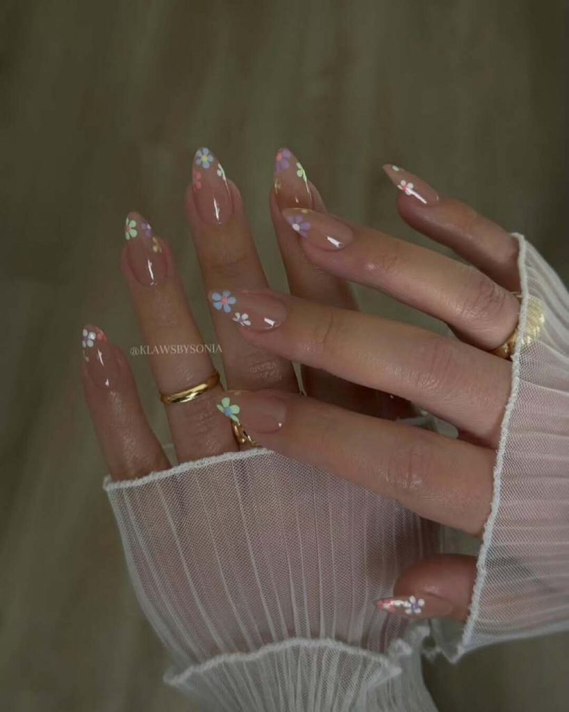 A vibrant and playful selection, pastel skittle nails display various pastel shades on each nail for an entertaining effect. The inclusion of daisy designs provides a fanciful and feminine touch to charming spring nails. This manicure is ideal for celebrating the lively and bright spirit of spring.