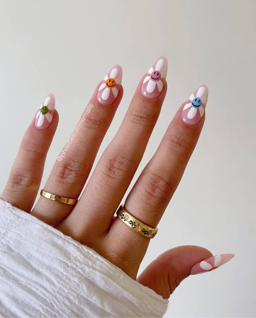 26. Pastel Skittle Spring Nails With Adorable Daisy Designs