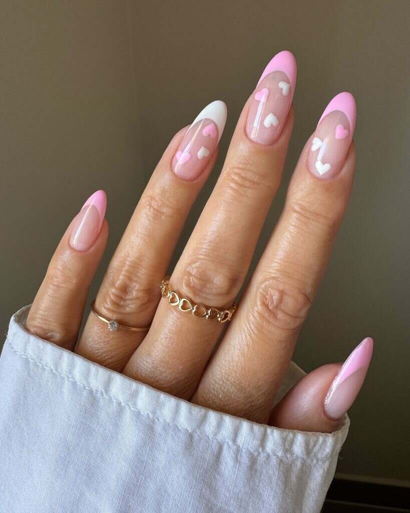 Whimsical and gentle, hearts and blush nails incorporate soft rose shades with heart-shaped details. This design lends a delightful and feminine essence to charming spring nails, making them perfect for the season. The understated patterns impart a sweet and classy aura.