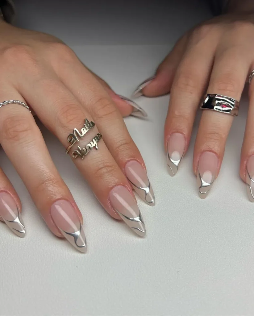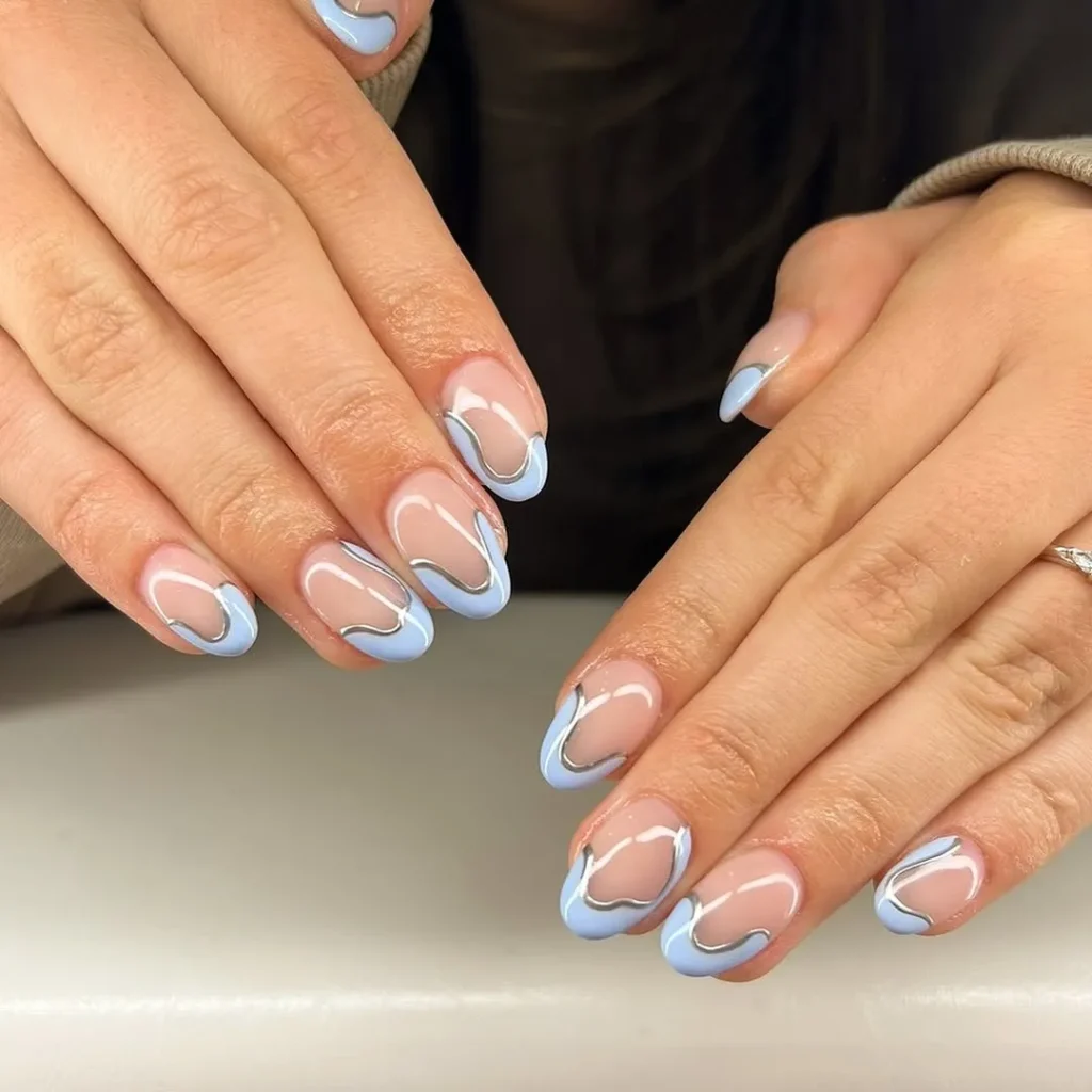 A fusion of contemporary art and high-shine metallics, abstract chrome nails present a stylish, futuristic allure. With freeform designs and a glossy finish, they offer a unique take on adorable spring nails. This bold yet refined look is ideal for trendsetters.