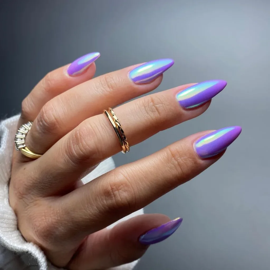 A whimsical mixture of soft, glistening tones, pastel chrome nails introduce a modern twist to traditional spring colors. The shiny, reflective finish presents a contemporary yet delicate appearance, making them ideal for the season. Adorable spring nails of this kind bring sophistication and versatility to any ensemble.