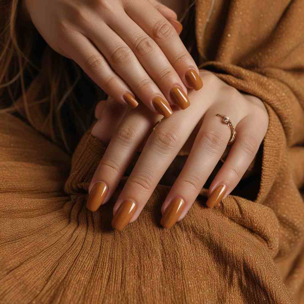 Warm Caramel fall dip nails offer a cozy and welcoming effect with their rich, caramel tint. This traditional fall hue adds a sense of warmth and elegance to your manicure. Perfect for those seeking a classic yet fashionable autumn appearance.