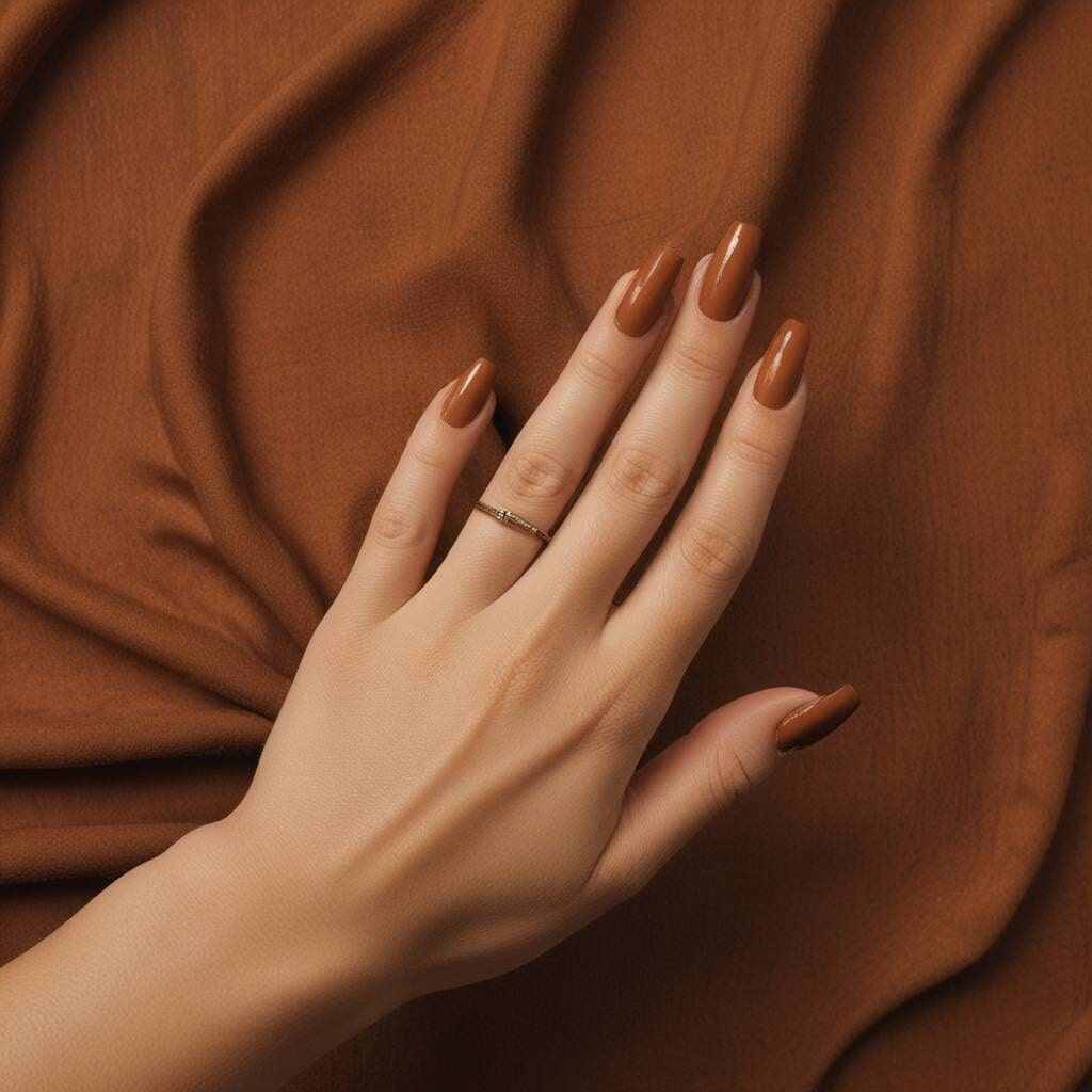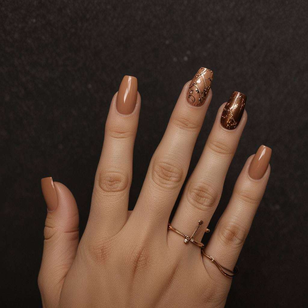 Dark Chocolate and Auburn Fall Nails comprise a rich chocolate base complemented by vibrant auburn highlights and abstract stripe designs. This luxurious and distinctive blend is perfect for those seeking a remarkable manicure this fall.
