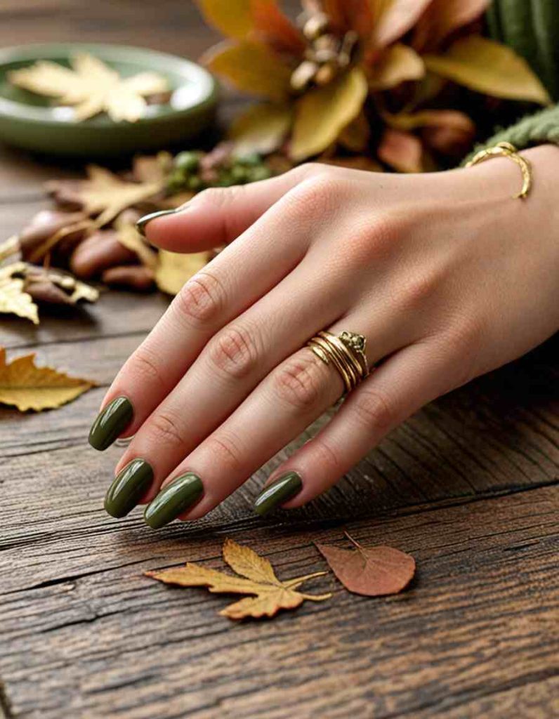 Embrace the essence of autumn with Olive Green fall dip nails that emanate a natural, earthy allure. Perfectly aligned with the season, these nails capture the richness of fall foliage. Infuse elegance into your style with this deep, forest-inspired tone.