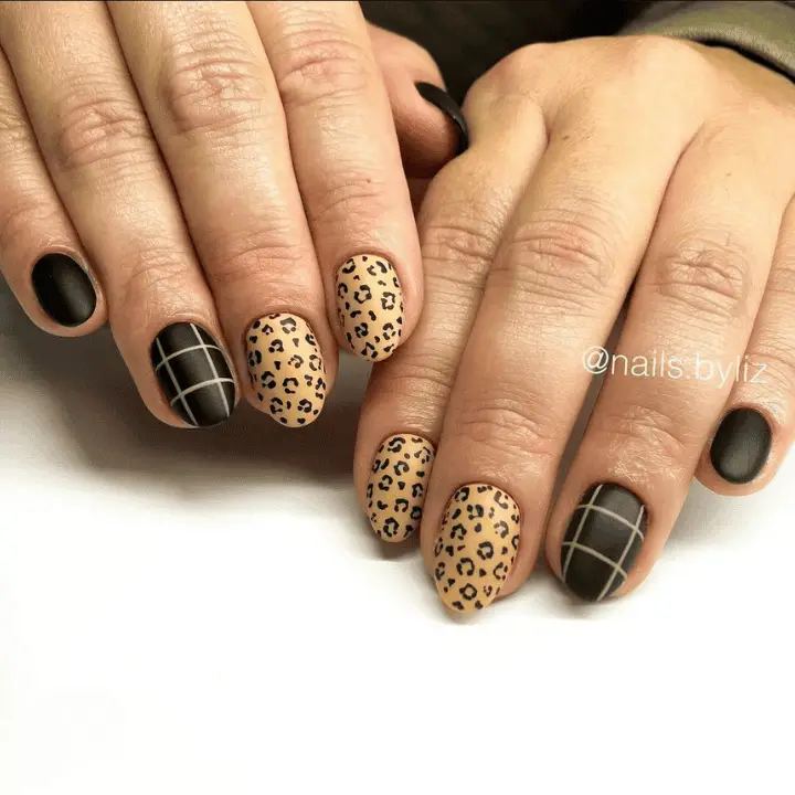 Black, Cheetah Print, and Pinstripe Accents fall dip nails merge a sleek black base with striking cheetah print and pinstripe details. This bold and trendy design is perfect for making a statement this autumn season.