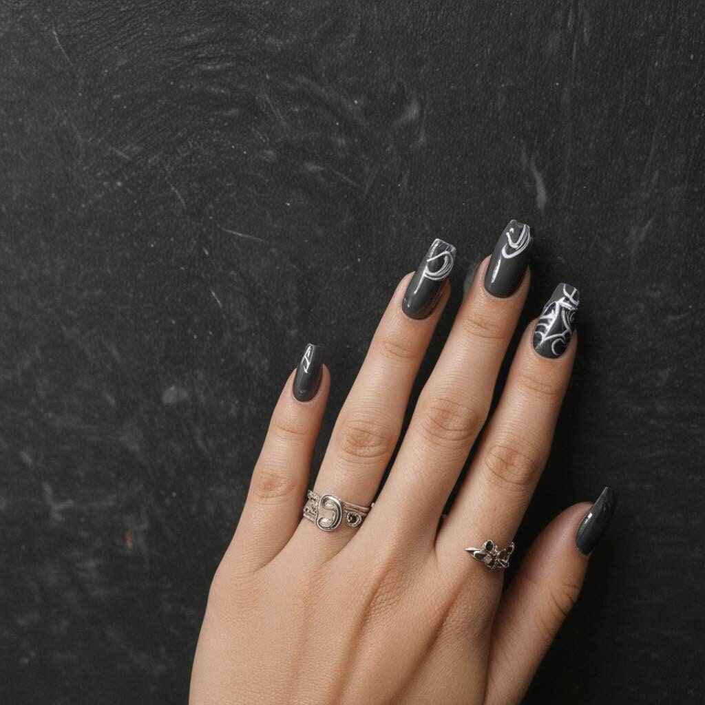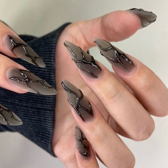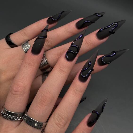 21. Alluring Black Swirls on Almond Nails