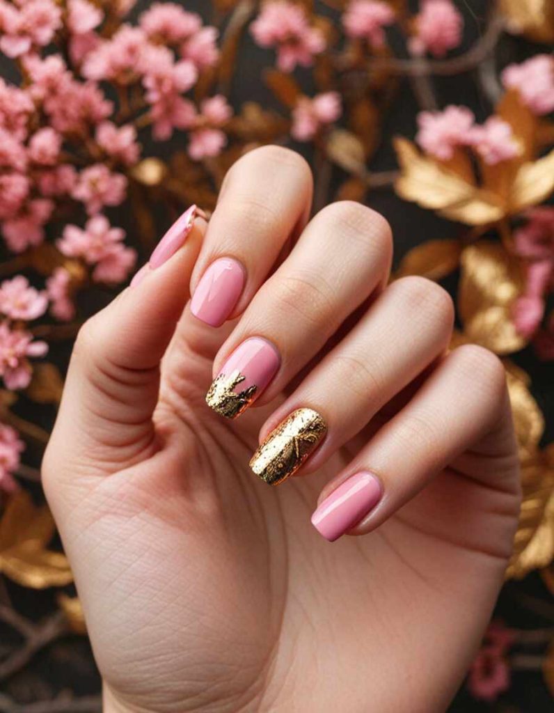 Blush Rose with Gold Leaf fall dip nails present a soft pink base embellished with exquisite gold leaf details. This graceful and feminine design adds an air of sophistication to your autumn manicure. Ideal for those who admire a subtle yet fashionable style.