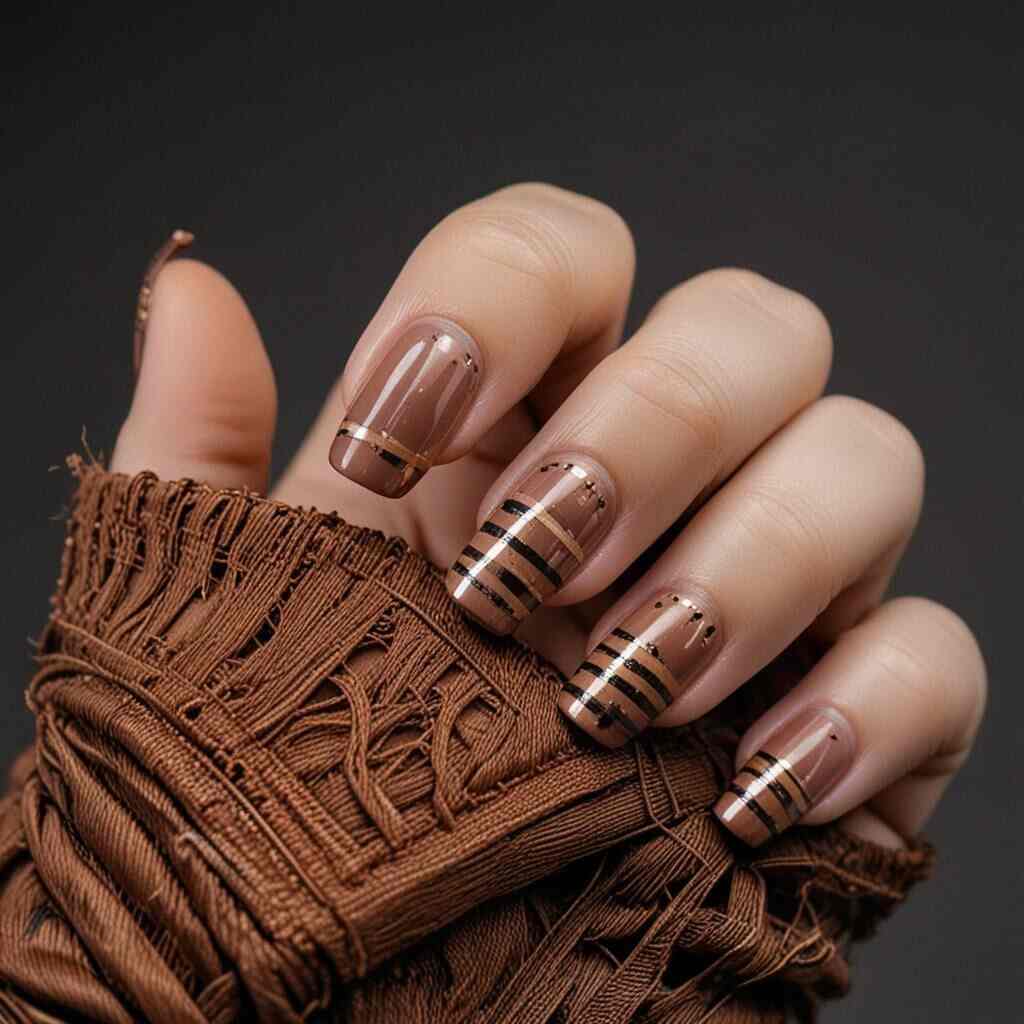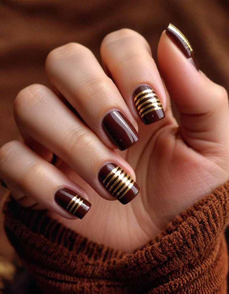 19. Dark Chocolate and Auburn Fall Nails with Abstract Stripe Designs