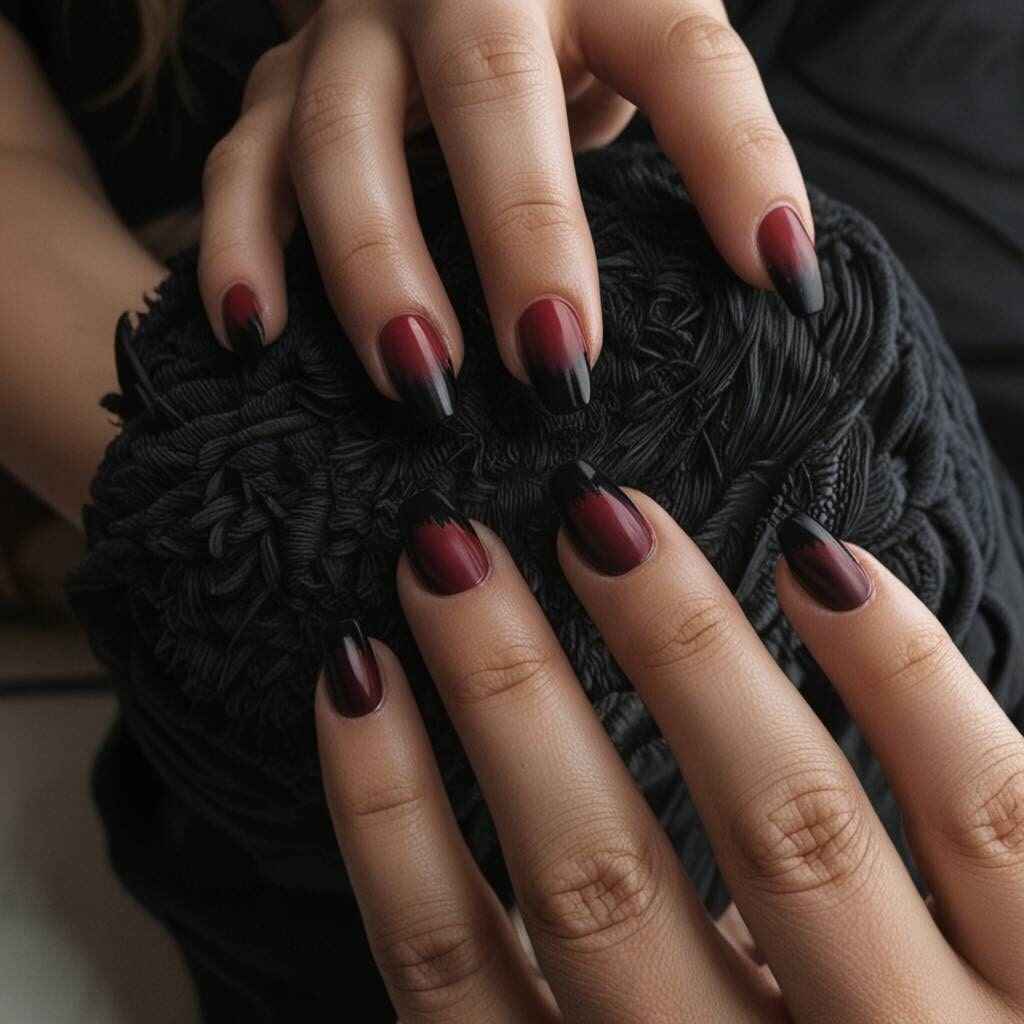 Crimson with Matte Black Ends fall dip nails present a vivid crimson base featuring striking matte black tips. This edgy and fashionable design is perfect for making a pronounced statement this fall season. Excellent for those who prefer a striking manicure.
