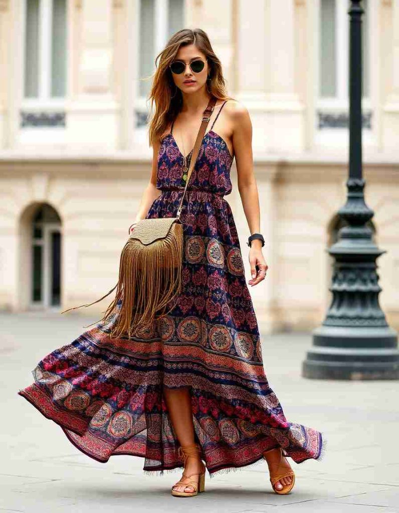 This bohemian-inspired Parisian look showcases a maxi dress, complemented by a fringed bag and gladiator sandals. The model’s free-spirited essence perfectly encapsulates the laid-back allure of a Parisian outfit. The softly blurred background enhances the relaxed, boho ambiance of the attire.