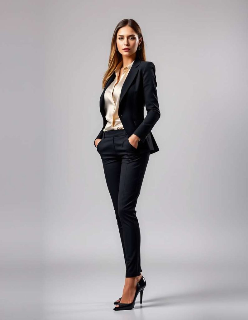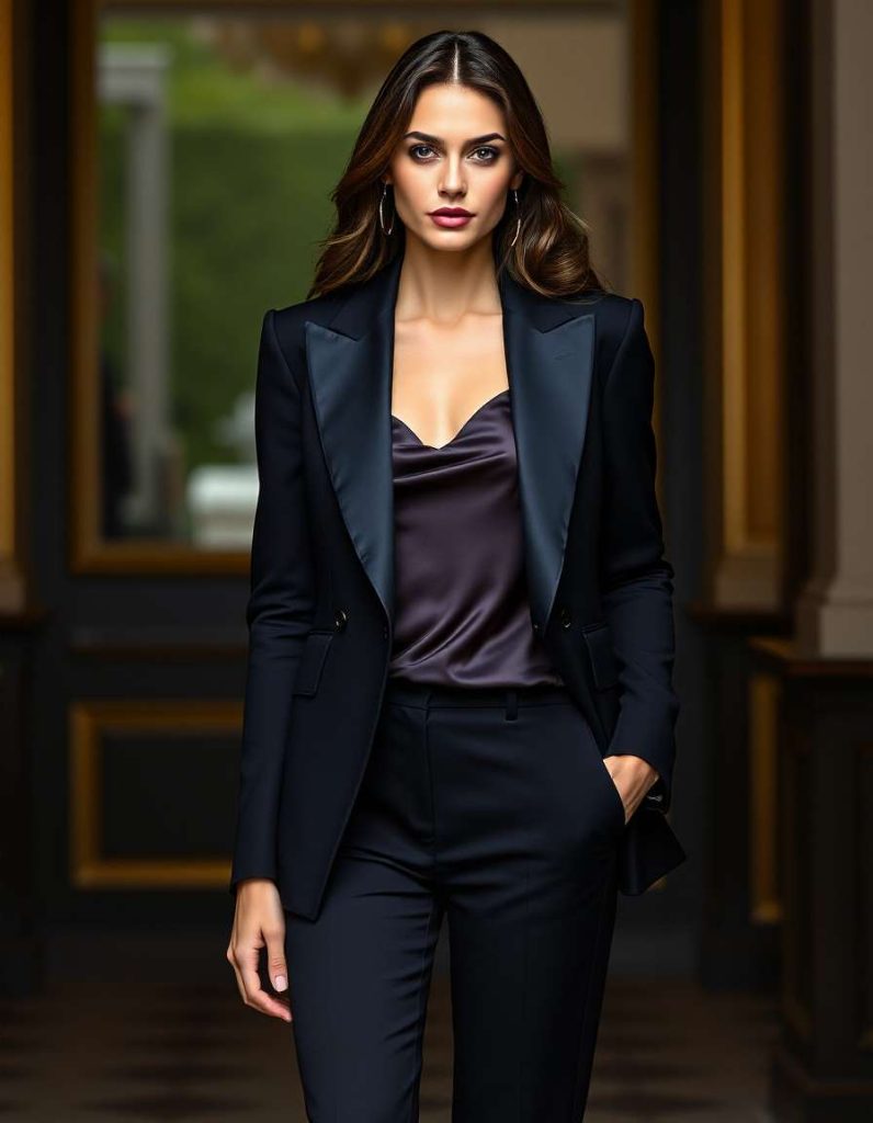 This sleek tuxedo-style Parisian outfit features a black tuxedo jacket layered over a satin camisole, black trousers, and heels. The model’s assertive pose reflects the bold and chic nature of Parisian fashion. A softly blurred backdrop emphasizes the crisp, elegant lines of this fashion ensemble.