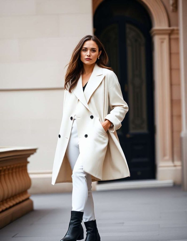 fashion sophistication. The model’s graceful stance and stylish appearance exhibit Parisian elegance. The gently blurred backdrop introduces an additional element of refinement, maintaining the spotlight on this ageless Paris outfit.