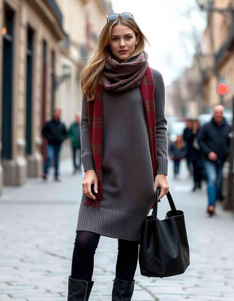 This comfortable yet stylish Paris outfit consists of a simple sweater dress, scarf, tights, and boots. The model exudes Parisian charm in this relaxed yet fashionable ensemble. The softly blurred background reflects the effortless elegance of a day spent in Paris.