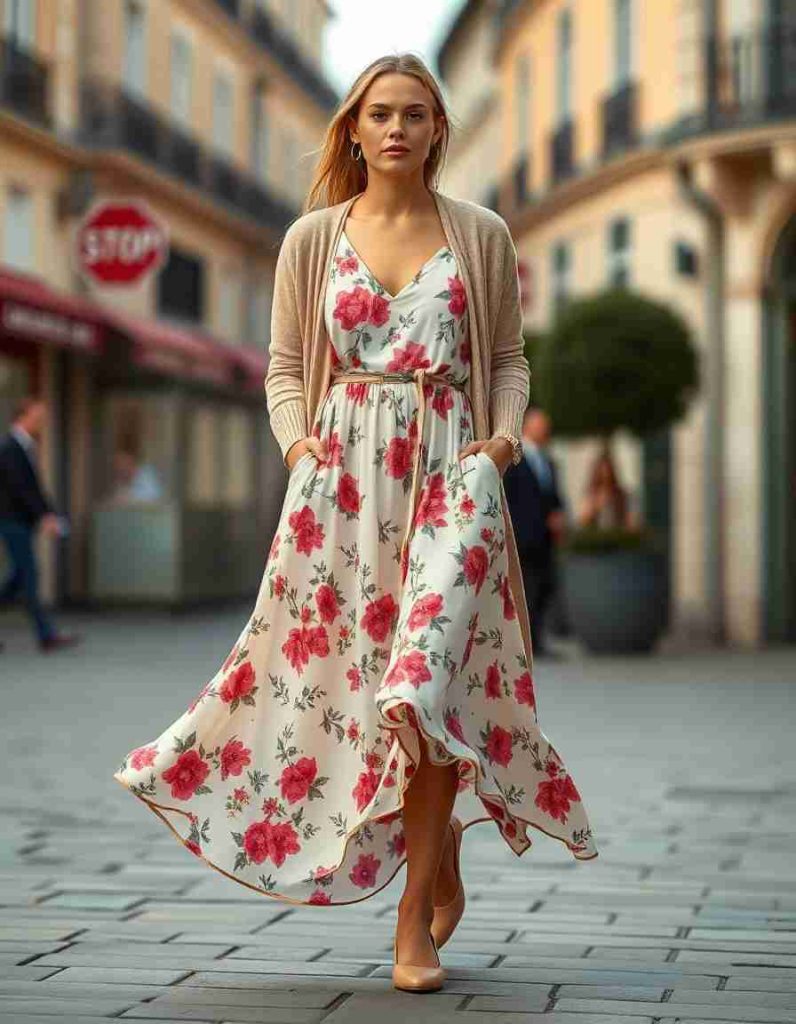 For a laid-back Parisian feel, this flowing midi dress adorned with floral patterns is combined with a light cardigan and ballet flats. The model’s easy-going expression and relaxed stance exemplify the effortless charm of Parisian attire. A blurred background depicting a Parisian café enriches the serene vibe of the ensemble.