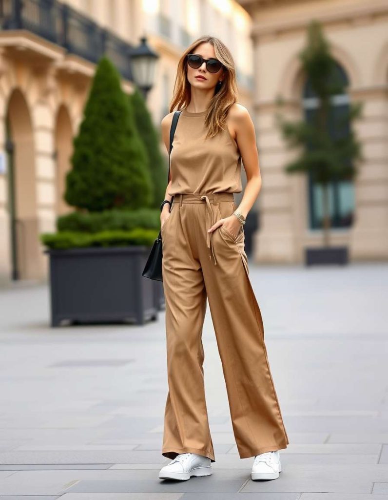 A laid-back Paris fashion jumpsuit with wide legs and sneakers embodies a relaxed, stylish atmosphere. The model’s casual stance and assured expression encapsulate the spirit of Parisian street style. The blurred backdrop keeps attention on the model’s effortlessly chic Paris appearance.