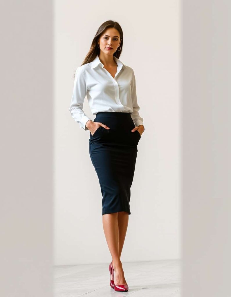 A tight-fitting pencil skirt worn with a tucked-in blouse and heels presents a sophisticated Paris fashion image. The model’s confident posture embodies the essence of timeless Parisian style. The softly blurred background allows the clean lines and elegance of the Paris outfit to shine.