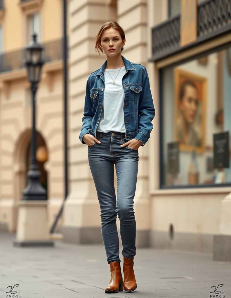 A denim jacket layered over a white tee and high-waisted jeans forms a casual yet stylish Paris fashion appearance. The model’s Parisian street style comes alive through her relaxed stance. The hazy background draws attention to this effortlessly fashionable Paris outfit.