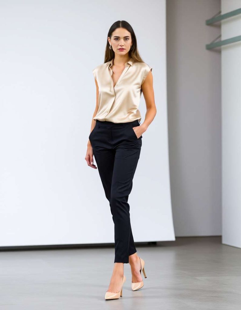 A pair of tailored trousers with a silk top and pointed-toe shoes epitomizes a sleek Parisian outfit. The model exudes confidence with her Parisian grace and poise. The softly blurred background allows the sharp tailoring and luxurious appeal of this Paris fashion ensemble to stand out.