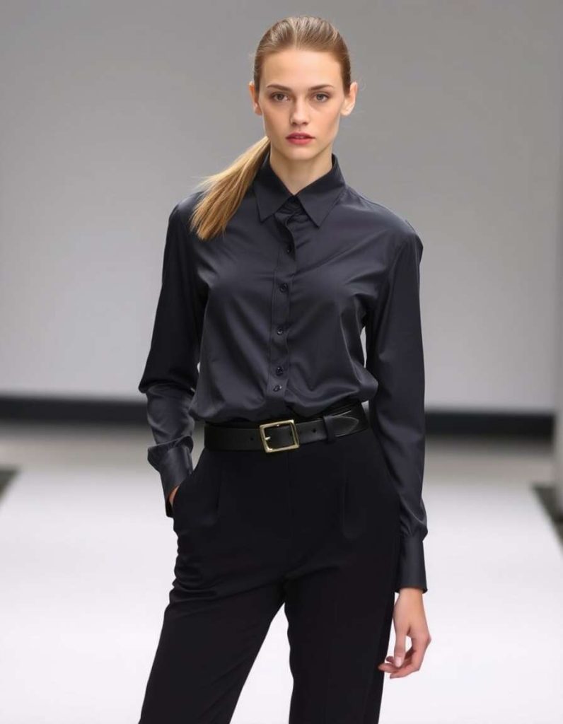 This sleek monochrome Paris fashion outfit consists of a black silk blouse tucked into black tailored trousers, producing a refined and streamlined appearance. Paired with matching heels, the model embodies Parisian chicness. A gentle, blurred background adds an elegant nuance to this polished Parisian outfit ensemble.