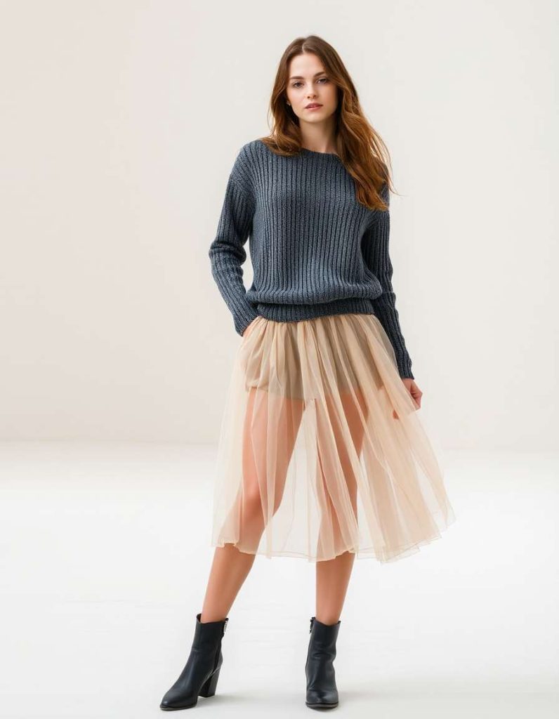 Celebrate enchanting Paris fashion with this delicate tulle skirt paired with a fitted knit sweater and ankle boots. The model’s gentle and whimsical expression harmonizes beautifully with the light, airy aesthetic of the outfit. The blurred background accentuates the romantic nature of this Parisian outfit ensemble.