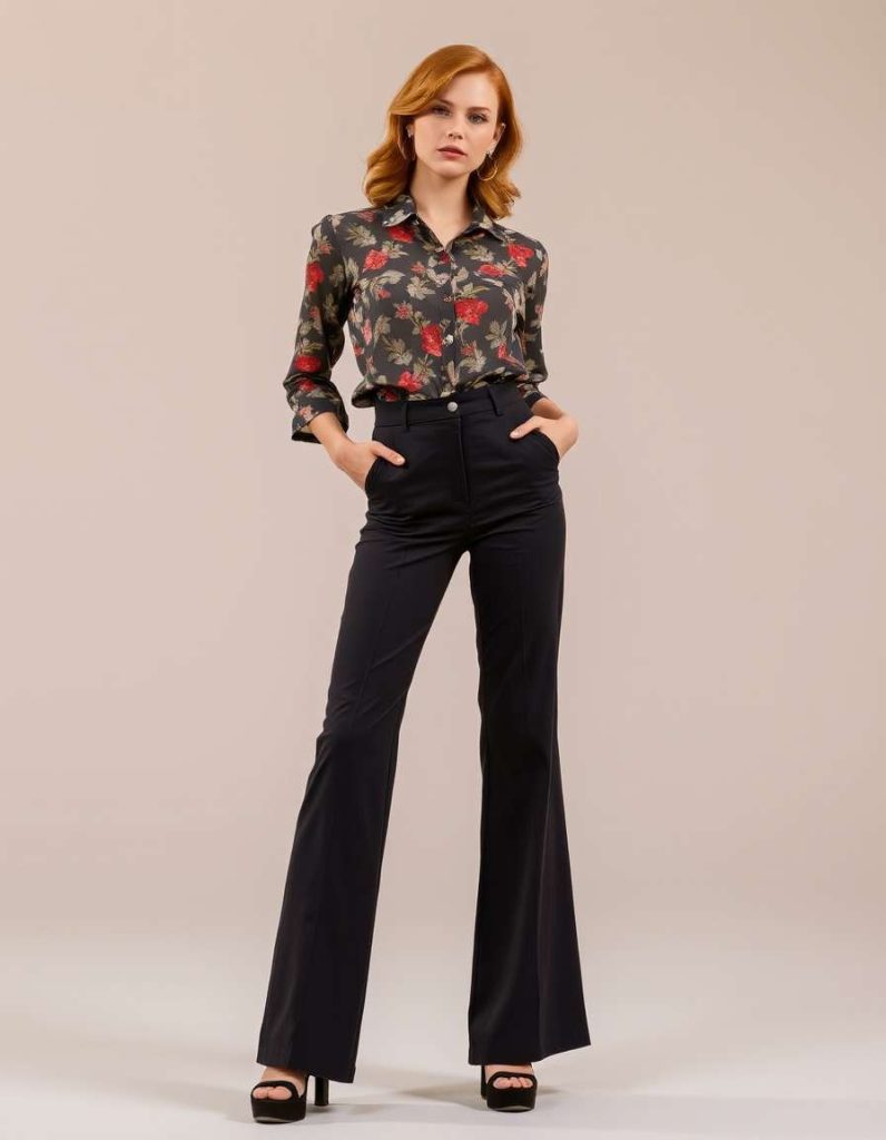 This vintage-inspired Paris clothing look showcases high-waisted bell-bottom pants, a floral blouse, and platform heels. The model’s confident posture reveals the timeless grace of Parisian street style. The soft blurred background maintains focus on this chic and nostalgic Paris fashion display.