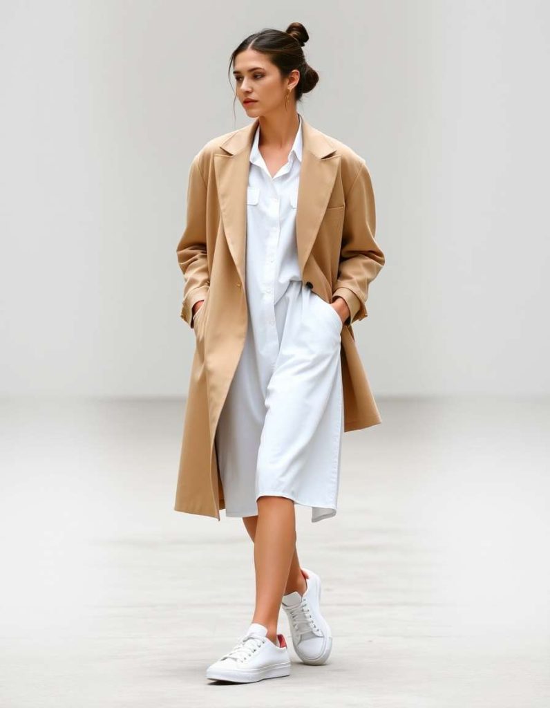 This modern minimalist Parisian outfit comprises an oversized neutral-toned blazer worn atop a white shirt dress, paired with sneakers. The model’s low bun and understated makeup emphasize the stylish yet casual essence of the outfit. The soft background enables the sleek lines of the Parisian fashion look to shine.