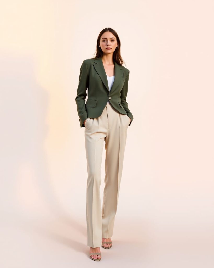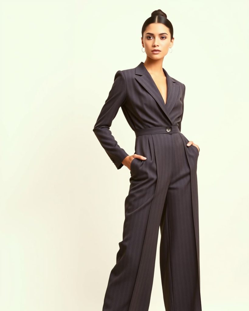 A tailored blazer paired with wide-leg trousers exudes professional sophistication while still being suitable for an evening out. This ensemble strikes a balance between chic and classy, ideal for those who desire a polished yet relaxed look.