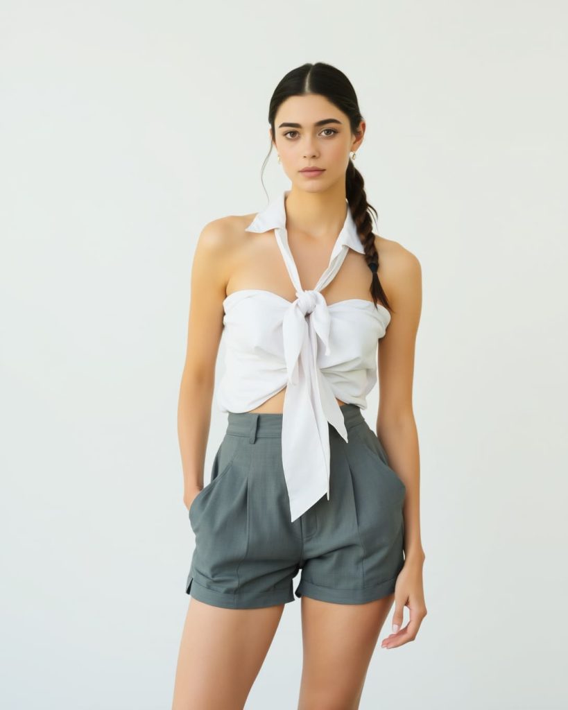 High-waisted shorts accompanied by a tied blouse craft a flirtatious and playful outfit for an evening out. This combination stands out as one of the most effortless yet stylish going out ensembles, perfect for a summer night of cocktails and dancing.
