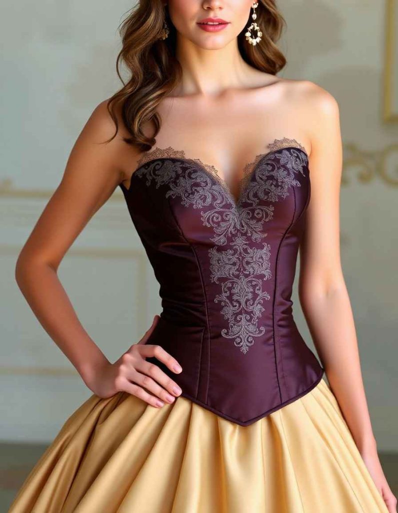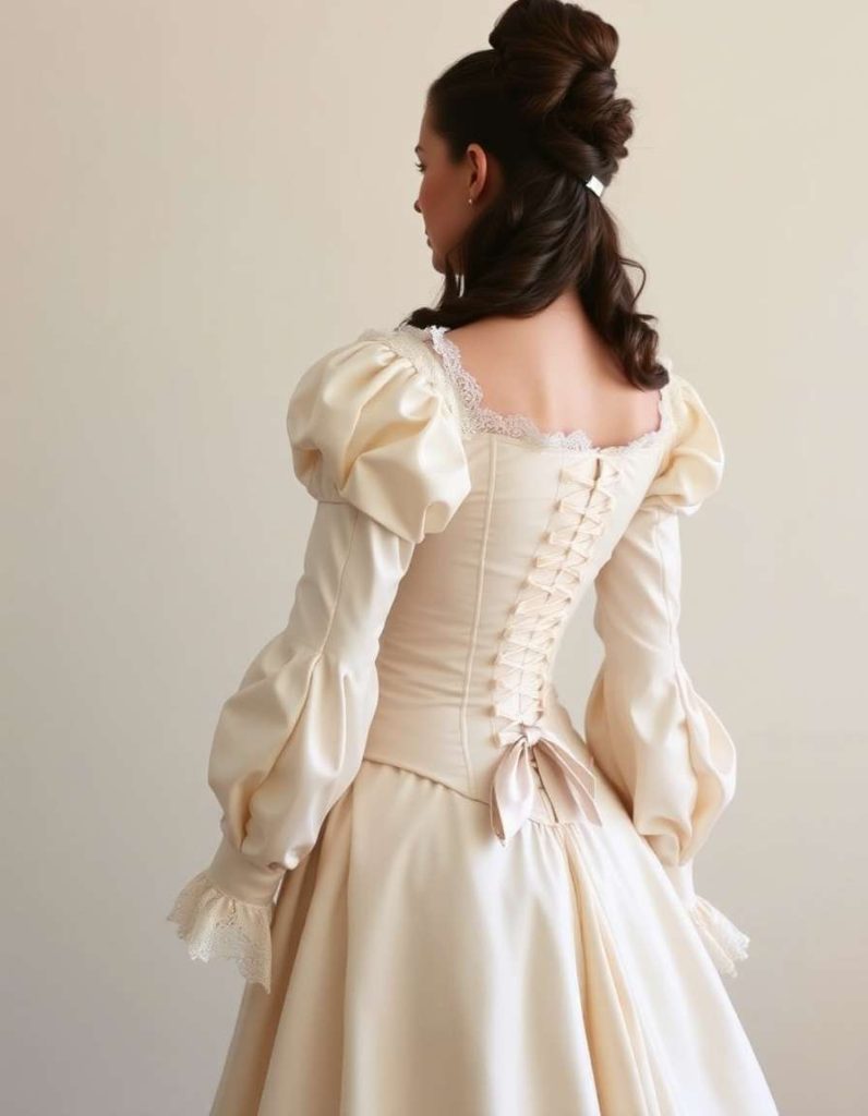 Besides their visual appeal, these Rococo outfits often underscored the significance of structure, particularly with garments such as the Rococo corset gown, which firmly constricted the waist and supported the intricate designs of the period. This fusion of structure and delicate embellishments achieved a perfect balance between sophistication and ease, rendering the Rococo silhouette not only visually striking but also an indication of the wearer’s social standing and grace. Whether donned at a Rococo tea event or a formal court gathering, these dresses were engineered to impress, merging royal splendor with an aura of romantic elegance.
