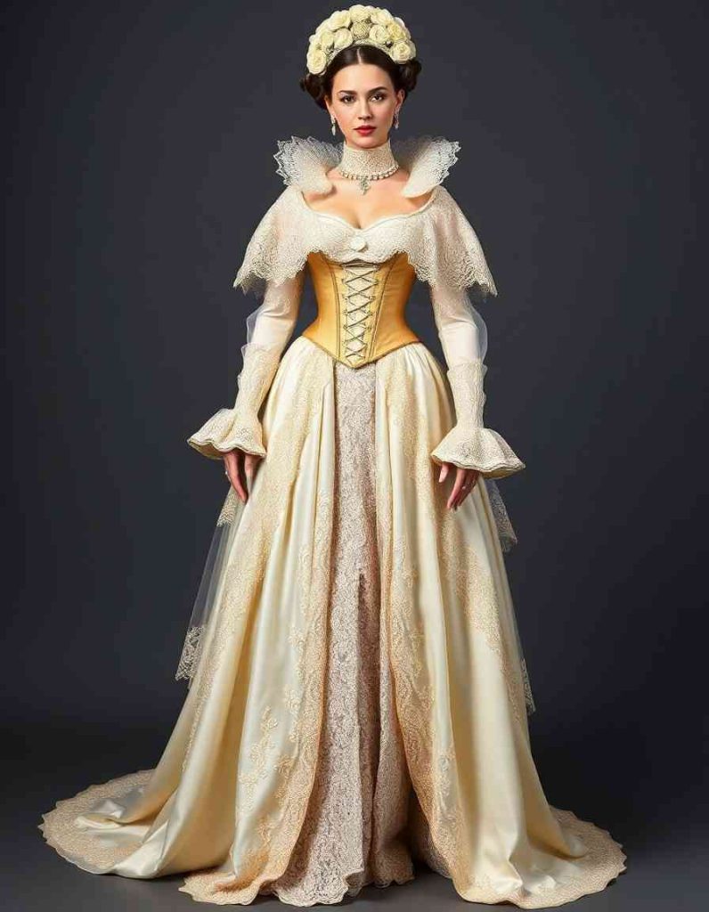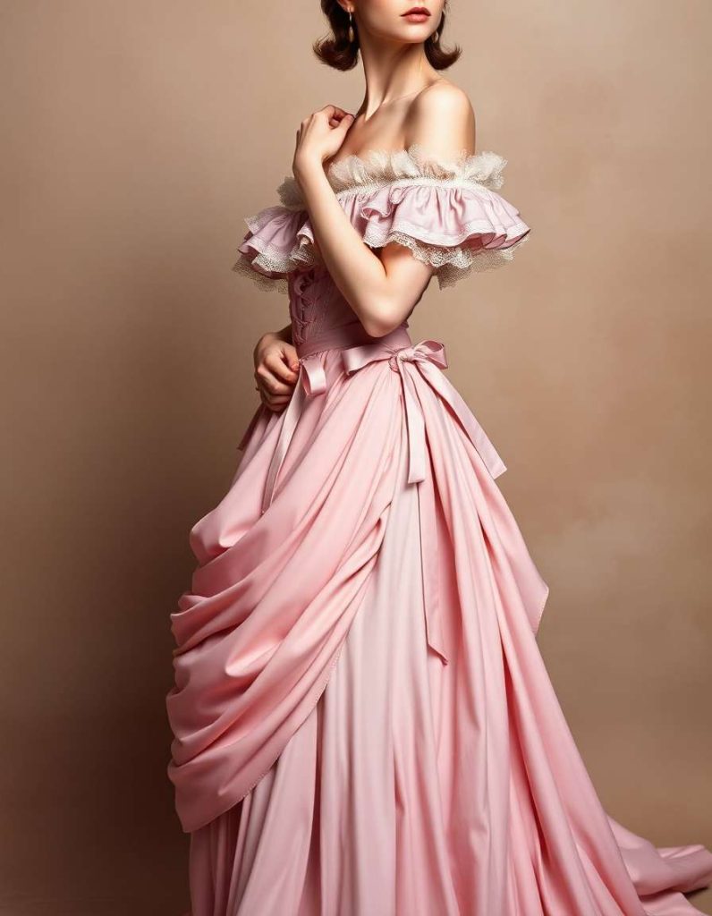 Rococo ball gowns stand as the pinnacle of elegance and magnificence, characterized by their full skirts and elaborate lace details. These dresses were crafted to attract attention, frequently incorporating delicate elements like floral stitching, silk materials, and exquisite satin. The Rococo ball gown remains a cornerstone of historical fashion, continuously enchanting designers and fashion lovers alike. The Lace-Trimmed Rococo gown, for example, emphasizes the era’s dedication to meticulous artistry, featuring exquisite lace edges and puffed sleeves, evoking a sense of grace and feminine allure.