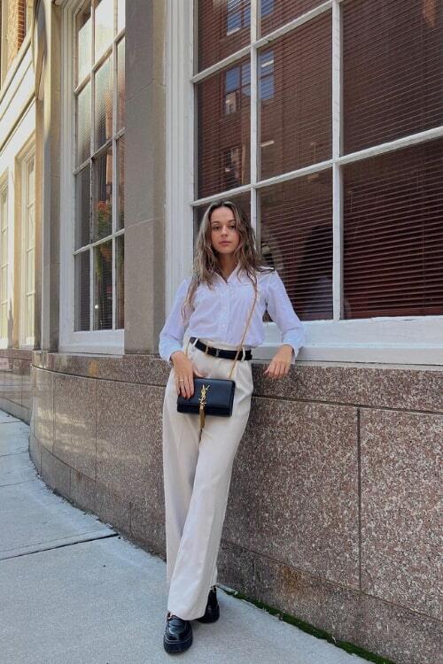 Choose a timeless white blouse with beige slacks for a sophisticated and elegant interview outfit. The white blouse ensures a crisp, clean look, while the slacks provide a versatile and professional finish. This ensemble is ideal for leaving a strong, lasting impression.
