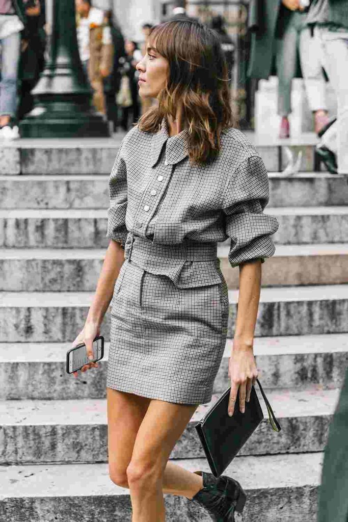 27. Grey Blazer with a Checked Skirt