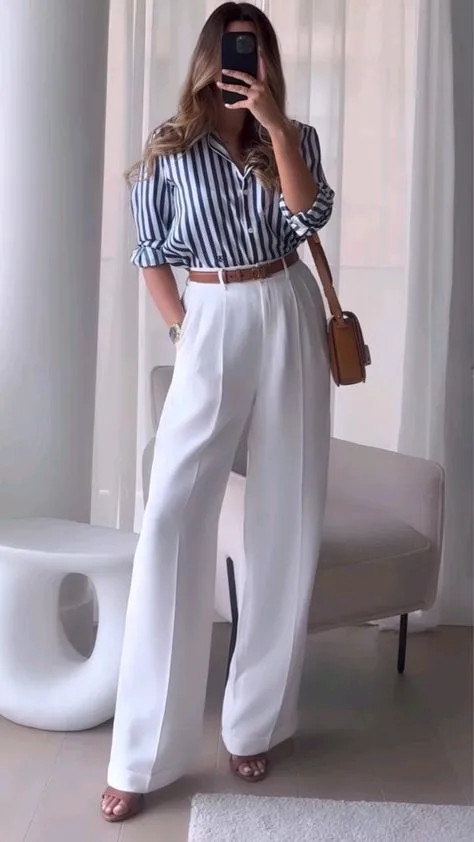 A modern striped shirt matched with white pants craft a stylish and contemporary outfit for interviews. The stripes provide a dynamic flair, while the white pants maintain a fresh and professional appearance. This outfit is perfect for highlighting a chic and polished style.